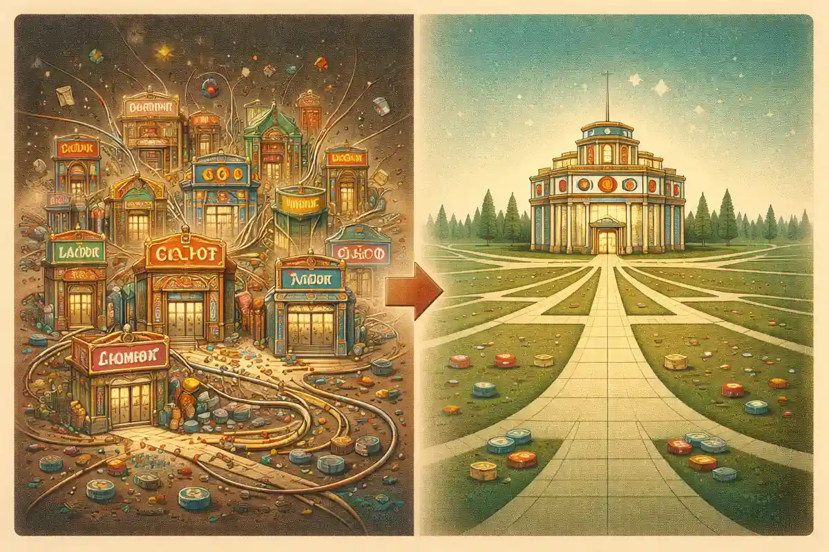 Illustrazione panoramica in stile mid-century che mostra il passaggio da una struttura complessa e frammentata a un sistema più ordinato e lineare. L’immagine accompagna un articolo sulla riforma del gioco online in Italia e sulla fine delle skin, evidenziando il concetto di semplificazione e controllo del mercato.