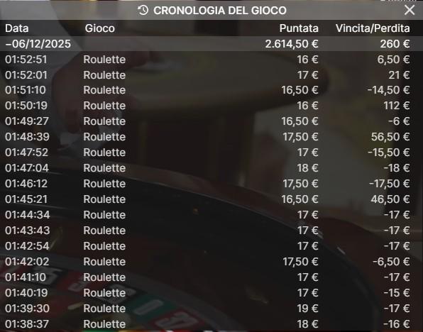 UPDATE sessione 1 del 5 dicembre 2025 La cassa iniziale ha superato i 1000 € per un bonus. Ora parto da 1000 € al tavolo. CASSA INIZIALE 1000 € CASSA FINALE 1092,50 € 1 sessioni di gioco // boules viste 65 _ puntate effettuate 63__ [OPERAZIONI CHIUSE IN GAIN] 19 --- [CHIUSE IN LOSS]46. Tempo di gioco : 50 minuti. GAIN IN PERCENTUALE SUL BANKROLL INIZIALE 9,2 %. ROIC 18,06% DRAWDOWN MAX --> -3,3%. Sono tornato ad applicare i miei metodi, seguendo il money mgmt corretto. A presto. - Ultima settimana