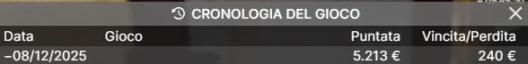 UPDATE sessione 3 del 5-6 dicembre 2025 CASSA INIZIALE 1000 € CASSA FINALE 1211 € 2 sessioni di gioco // boules viste 182 _ puntate effettuate 181__ [OPERAZIONI CHIUSE IN GAIN] 32 --- [CHIUSE IN LOSS]149. Tempo di gioco : 130 minuti. GAIN sul BANKROLL INIZIALE AL TAVOLO 20,4%. DRAWDOWN MAX --> -50%. Ho effettuato due sessioni con drawdown importante rischiando anche troppo. La rapidità del gioco induce a scommettere senza riflettere molto. L'imposizione di regole stringenti è fondamentale. Mi auguro di portare risultati migliori nelle prossime sedute, soprattutto in termini di ROIC e risk mgmt. Nell'immagine è riportarto un giocato inferiore con un maggior profitto, in quanto la sessione degli ultimi 15 minuti del 5 dicembre riportava : un giocato di 171,50 € una perdita di 63,50 € quindi ROIC di -37,02 %. Sommando le due sessioni di giorni separati ho ottenuto volume di gioco di 2786 euro , utile di 204 euro ROIC 7,32% L'intento nelle prossime sedute è: ridurre il rischio per ogni attacco troppo alto e dispendioso 1,7% ed oltre è troppo ridurre di conseguenza il volume totale di gioco e quindi ottenere un ROIC più alto (massimizzare profitto). -