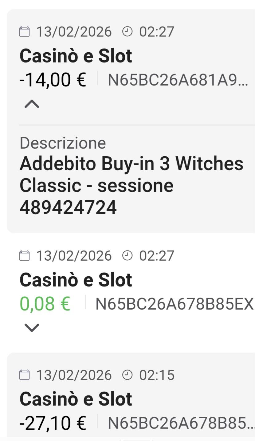 Capisco il tuo punto di vista, ma qui non si tratta di 'dire o non dire', si tratta di fatti tecnici documentati che violano il regolamento ADM. Ecco perché non accetto repliche vaghe: Validazione del Bonus: Il server ha generato la stringa 'Hai vinto il bonus tre streghe' (ID giocata: M65BC2464F2F83PF). Nel momento in cui il server valida un bonus, quel bonus diventa un diritto acquisito del giocatore. Malfunzionamento Bloccante: Il sistema non è andato in pausa, è crashato. Al rientro, invece di ripristinare il Bonus (come previsto dai protocolli di continuità del gioco), il sistema ha scalato saldo reale per tiri normali (ID: N65BC26A681A92WA). Questo è un errore contabile gravissimo. Sparizione della Slot: La slot '3 Witches Classic' è stata rimossa dal sito subito dopo il mio crash. Se fosse stato un problema 'utente', la slot sarebbe rimasta lì per gli altri. Rimuoverla è un'ammissione implicita di un bug lato provider. Ammissione del Team VIP: Ho gli screenshot della chat dove l'assistenza ammette che la sessione era 'rimasta appesa' e che 'solo il provider poteva chiuderla'. Se la sessione è appesa, il risultato non è stato processato correttamente. Dire che 'non si deve dire così' non cancella i log tecnici. Chiedo solo che venga applicata la trasparenza che il regolamento ADM impone