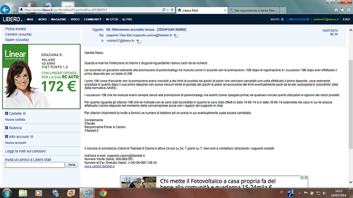 Io ho esposto il problema delle email che non hanno nulla a che vedere con le percentuali di vincita. Se poi vorresti qualche info in merito eccoti accontentata: I casino aams sono molto diversi da quelli con licenza europea e non lo dico io lo dicono i dati di fatto lo puoi benissimo constatare anche te, se ti fai un giretto su internet con pizzico di buona volontà, scoprirai che c'è stata gente che ai siti (.com) ha vinto somme stratosferiche a dispetto dei siti aams tali vincite non esistono. E questo è già un brutto segnale ma non centra nulla con il thread in questione perché lo si capisce dal titolo. Riguardo a chi si rovina, è vero che succedeva anche prima, ma prima quelli non erano casinò aams e non erano legali come ci vuole far credere l'aams riguardo la possibilità di miglioramento al giocatore ma soprattutto la tutela che non esiste pe niente. Se io da giocatore cittadino ho davvero questa tutela non vedo il motivo per cui non rispondi alle email. Non capisco perché non intervieni quando un concessionario ti ruba 10 euro (come fatto da TitanBet ai miei danni). Per quanto riguarda i pagamenti delle vincite? Adesso ci manca solo che non pagano, ma stai tranquilla che quanto prima uscirà anche questa legge
