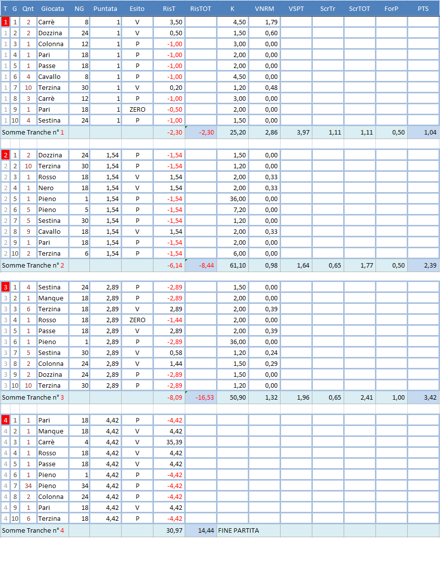 Comunque Oscarellino nel suo ultimo post si riferiva ad una delle peculiarità di questa manovra e cioè capire a che punto siamo nei confronti dello scarto. Se puntiamo su una chance a massa pari è facile: mi aspetto di vincere metà delle volte e perdere l'altra metà, quindi è facile tenere il conto, ma se punto contemporaneamente tre pieni, un cavallo due carrè, una chance e vicini dello zero (cioè in pratica se punto contemporaneamente su più quote diverse) e prendo solo un pieno e una chance, come sono messo nei confronti dello scarto?