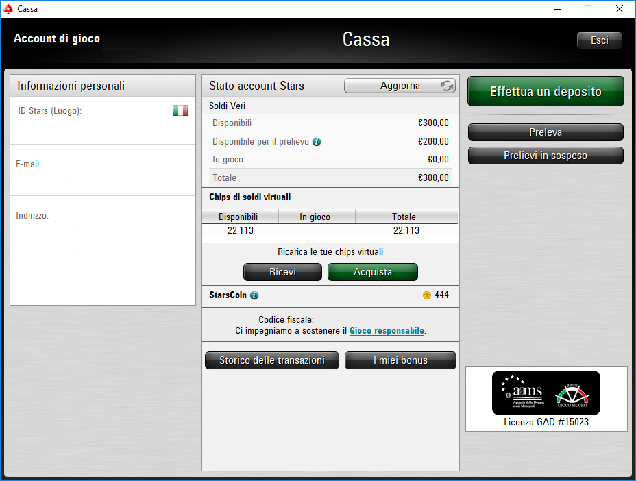 Da qualche tempo mi sono avvicinato a PokerStars.it: qualche mese fa ho versato 100 euro, fatto una giocata alla roulette, raddoppiato e prelevato i 200 euro, tutto regolare.