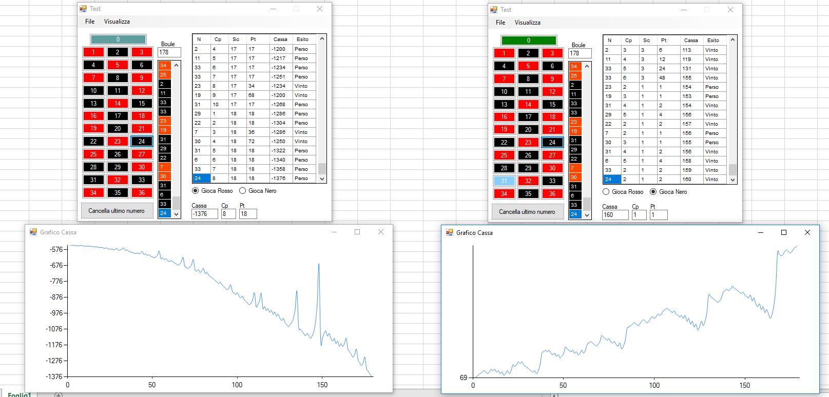 Ho effettuato due giocate sulla stessa roulette (una che punta solo nero, una che punta solo rosso) perché speravo in una cosa in particolare: che i due grafici si allineassero. Cioè nelle perdite (a scaglione 1 e puntata 1) del software che puntava nero, avrei potuto trovare vincite (a scaglione oltre il 10 e puntata assai elevata) del software che puntava rosso. Purtroppo così non è stato, nonostante i vari tentativi.