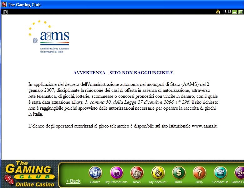 tipo il can bet non riesco a scaricarlo vado sul download e niente compare il messaggio , the gaming club uguale lo ho scaricato pero invece di vedere la pagina iniziale e le promozioni all'apertura vedo visso il messaggio della aams tu mi puoi aiutare a risolvere il problema? grazie ancora per la disponibilita