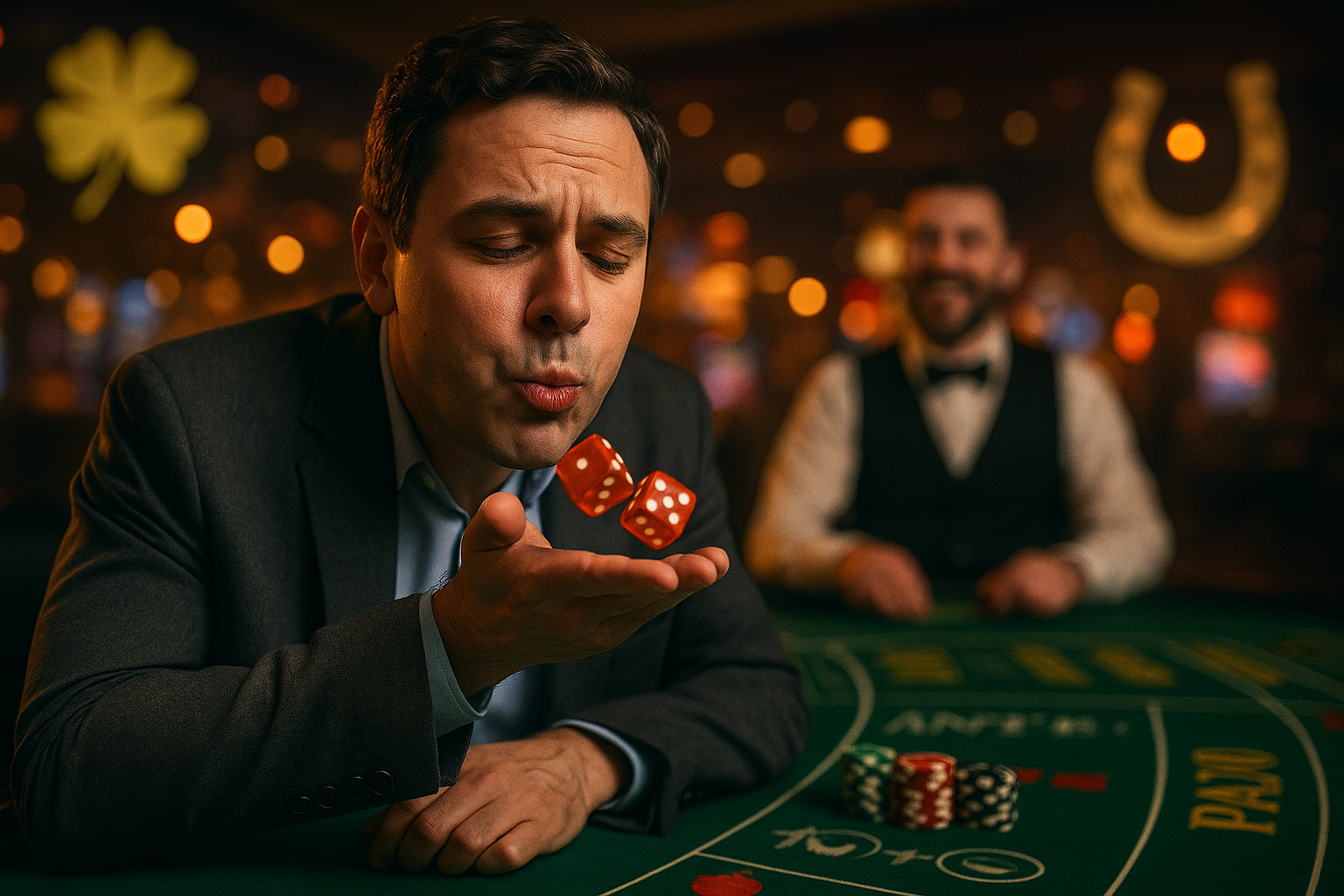 Un giocatore superstizioso affida la sua fortuna ai rituali, mentre il croupier al tavolo da blackjack osserva divertito.