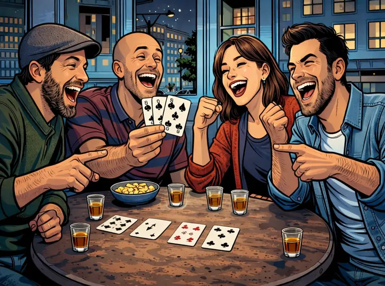 Una partita a cirulla tra amici: qualcuno ha appena fatto un bel punto e al tavolo partono sfottò, risate e cori improvvisati.