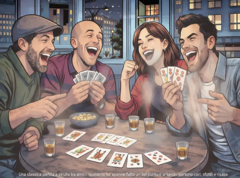 Una partita a cirulla tra amici: qualcuno ha appena fatto un bel punto e al tavolo partono sfottò, risate e cori improvvisati.
