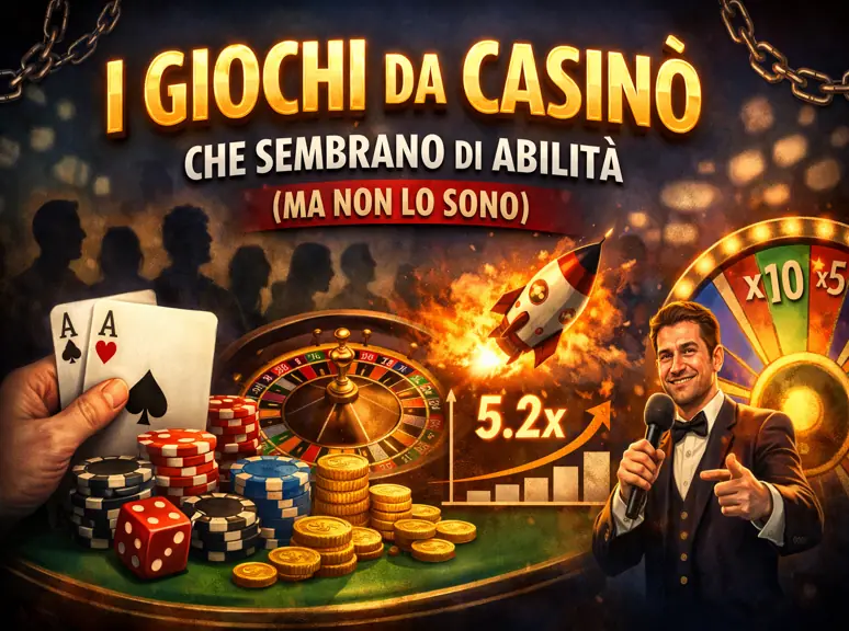 Illustrazione concettuale sui giochi da casinò che sembrano basati sull’abilità. Rappresenta blackjack, roulette, giochi live e crash game, evidenziando l’illusione di controllo del giocatore.