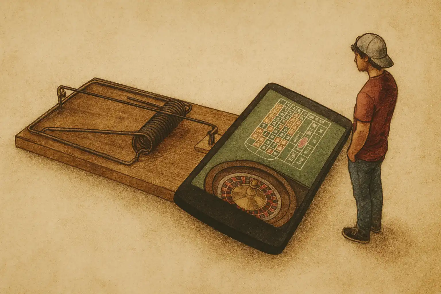 Imagem em estilo inspirado em Hokusai, mostrando um jogador a chegar perto de um smartphone gigante que exibe uma roleta e apostas de casino online, colocado sobre uma grande ratoeira de madeira. A cena sublinha o risco de cair em comportamentos de jogo pouco seguros.
